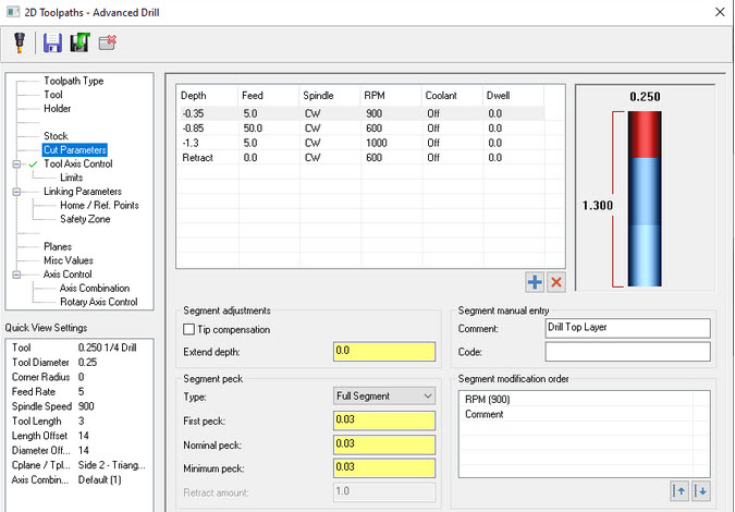Mastercam 2021 ima novu operaciju Advance Drill – prilagodljiv multisegmentni ciklus bušenja. Pomoću ove operacije možete svaki segment ciklusa bušenja definirati s posebnim parametrima. Sve navedene parametre definiraju se u „Cut Parameters“ tablici.