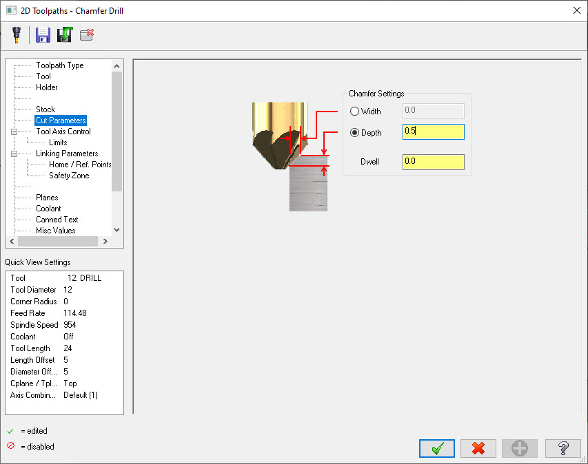 - U parametru „Cut Parameters“ odredite željenu širinu ili dubinu skošenja.