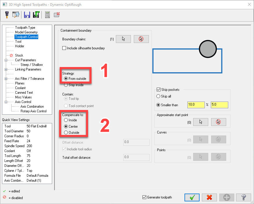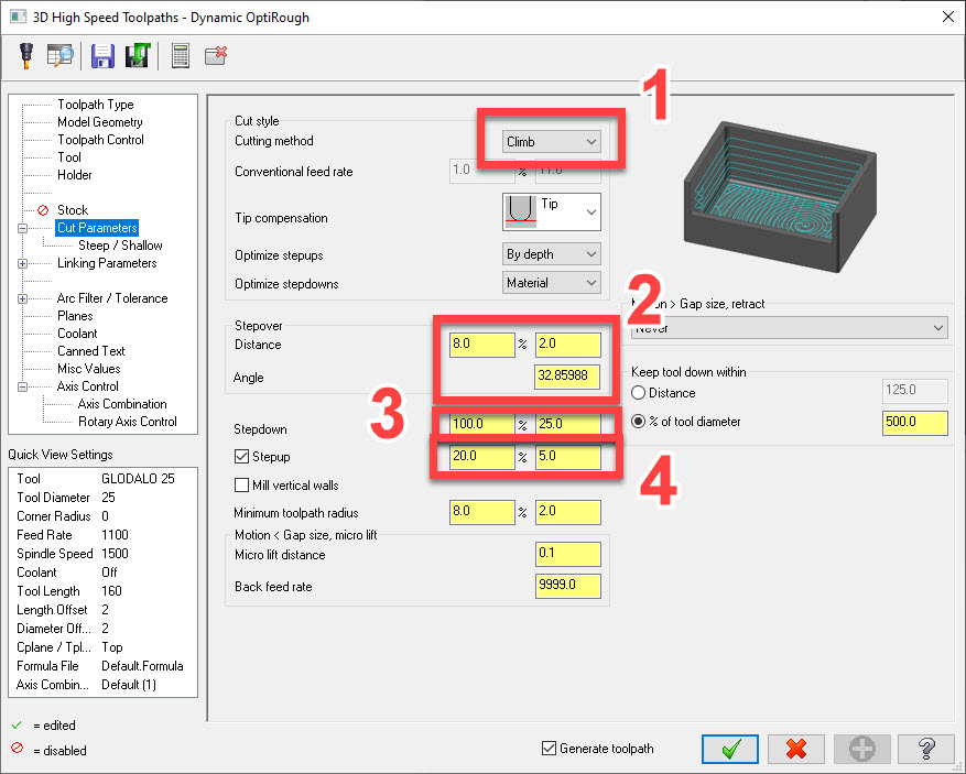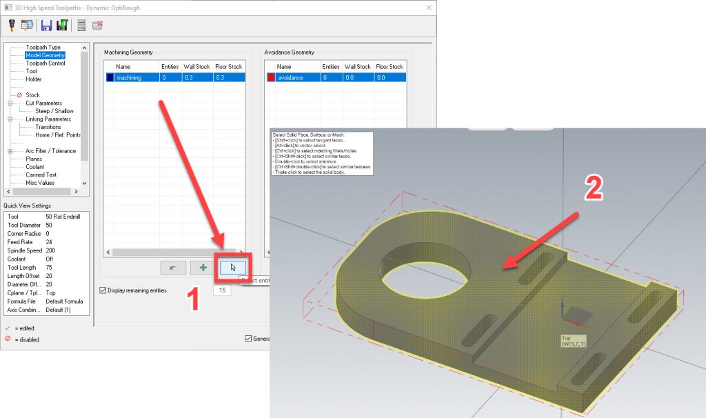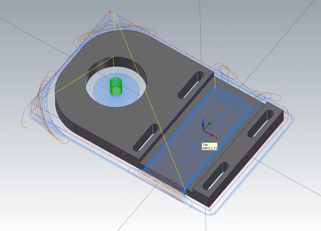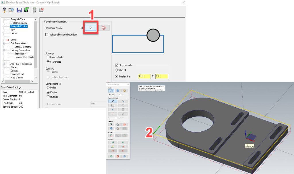 Kako smo i u prijašnjim objavama naveli, nova verzija Mastercam 2022 donosi brojna poboljšanja i prednosti nad prethodnim verzijama. Jedna od značajnijih poboljšanja je da svi korisnici 2.5D licence mogu koristiti operaciju Dynamic OptiRough koja se nalazi u segmentu 3D modula operacija.Stoga, za one koji do sada nisu radili s 3D operacijama ukratko ćemo opisati mogućnosti rada s navedenom operacijom kako bi Vam približili ono što dobivate s novom verzijom Mastercam-a.Do sada ste za grubo skidanje materijala Vašeg sirovca koristili operacije Dynamic Mill, Area Mill, Pocket ili slično. S više odabranih kontura ili više operacija počistili ste materijal koji treba otkloniti posebice ako model izgleda slično kao što je prikazan na niže navedenoj slici.U nastavku prikazati ćemo mogućnost korištenja operacije Dynamic OptiRough, te u jednoj operaciji s jednim klikom na solid označite ono što želite obraditi.1. Nakon što odaberemo stroj kojim želimo obrađivati model moramo formirati sirovac. Sirovac formiramo kao Bounding Box u poznatom nam sučelju klikom na ikonicu Bounding Box s vrijednostima nešto većim od samog modela. On se mora iscrtati u žičanoj geometriji kako bi koristili njegove granice kao granicu kretanja alata.2. Kliknemo na ikonu operacije OptiRough, te nam se otvara sučelje (prozor) operacije.3. U parametru Model Geometry pod Machining Geometry klikom na strelicu (1) kao što je dolje navedeno na slici odabiremo cijeli model za obradu (2).4. U parametru Toolpaths Controlbiramo granicu kretanja alata klikom na ikonu Boundary chains (1) i odaberemo s Wireframe Chain (2) granicu kretanja alata (wireframe geometrija bounding box).5. Nakon što smo odabrali Boundary chain (granicu kretanja alata) sada moramo u istom parametru odabrati još strategiju obrade i kiliko alat može odstupati od granice kretanja (dozvolu alata). Dakle odabiremo strategiju From outside (1) čime dozvoljavamo da alat kreće u obradu sirovca izvana granice (Boundary chain) ali s odstupanjem (2) Center ili Outside. Ukoliko imamo odstupanje postavljenu na Inside tada će postojati šansa da nam alat ne očisti sve vanjske dodatke na sirovcu, jer ima ograničenje da alat ne smije preći odabranu granicu.6. Nakon navedenog koraka prelazimo na drugi parametar Tool gdje odabiremo alat za obradu.7. Nakon odabira alata prelazimo na parametar Holder, te odaberemo držač.8. Sljedeći parametar za podešavanje je Cut Parameters gdje prvo odaberemo način obrade kakvo želimo imati (1): Istosmjerno (Climb), Protusmjerno (Convectional) ili Kombinirano (Zigzag) glodanje. Zatim stepover (2) gdje možemo upisti i zahvatni kut Beta u prozorčiću Angle čime odredimo koji je maksimalni zahvatni kut kojeg dozvoljavamo za odabrani alat. Navedeni parametar je u zavisnosti s parametrom Distance tako da kako mijenjamo Angle mijenja se i Distance ili obrnuto. U prozorčiću Stepdown (3) upisujemo koliko alat maksimalno može ići po Z osi u jednom prolazu. Ako u ovom slučaju ne uključimo prozorčić Stepup (4), a maksimalna dubina prolaza je veća nego dubina džepa na našem modelu isti džep neće biti obrađen. Stoga moramo uključiti prozorčić Stepup i upisati neku vrijednost prolaska po Z.9. U podparametru Steep/Shallow moramo označiti minimalnu i maksimalnu dubinu gdje dopuštamo da alat obrađuje sirovac. Klikom na Detect limits (1) Mastercam sam očita navedene vrijednosti konkretnog solid modela ovog primjera. Ako želimo da uzme u obzir i dodatke na pod i zid koje su određene u parametru Model Geometry tada moramo aktivirati i prozorčić Adjust for stock to leave (2). Ukoliko imamo stezne pripreme moramo paziti na dubine da se ne bi desilo da nam glodalo pređe preko njih.10. U parametrima Linking Paremeters se postavljaju vrijednosti o načinu ulaska i izlaska alata prilikom obrade, načini kretanja kod retrakcije i sl.11. U podparametru Transitions možemo odrediti načine ukopavanja ukoliko ih imamo u neke džepove. Možemo odabrati da se ukopava heliksoidom, profilnom rampom ili drugim mogućnostima.12. Kada smo sve parametre odredili i postavili kako je navedeno možemo potvrditi zelenom kvačicom, te provjeriti kako nam je stvorena putanja alata navedene operacije.Zaključak:Za navedeni primjer sam odabrao ravno glodalo 25, te vidimo kako je skinut materijal izvana modela (dodatak sirovca), počišćen je provrt (na lijsvoj stani modela) i džep (na desnoj strani modela). Vidimo zelenom bojom putanju alata ulaska (heliksoidno) u provrt što smo odredili u parametru Transitions. Vidimo da je vanjski dio materijala počišćen kretanjem alata izvana (a ne ukopavanjem) što smo odredili u parametru Toolpath Control odabranom strategiom From outside. S operacjiom Dynamic OptiRough uklonili smo materijal s više segmenata modela odjednom. Navedeno se ne može ukloniti s jednom operacijom u 2.5D modulu, što dovodi zo zaključka da smo uštedili na vremenu programiranja, vremenu obrade, a time smo postali produktivniji i brži.Ovo je u grubo prikazan osnovi rad s navedenom operaciom, a za sve ostale pojedninosti slobodno nas nazovite ili pošaljite upit na podrska@camteh.hr. U nastavku možete preuzeti .mcam datoteku s navedenim primjerom, te vidjeti simulaciju Dynamic OptiRough operacije na navedenmo primjeru.