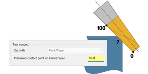 Prošle je godine Mastercam 2023 uveo mogućnost rezanja s bokom alata. Za Mastercam 2024 te su kontrole sada objedinjene u padajući izbornik u kojem korisnik bira hoće li rezati vrhom ili bokom alata. Ako korisnik odabere rezanje s bokom, pojavit će se opcija postotka. S ovom opcijom sada možete odrediti vrijednost (postotak) visine rezne oštrice alata. Ukoliko želite obrađivati sa dnom reznog dijela tada je vrijednost (postotak) bliža 0%, ukoliko želite obrađivati sa vrhom reznog dijela tada je vrijednost (postotak) bliža 100%.