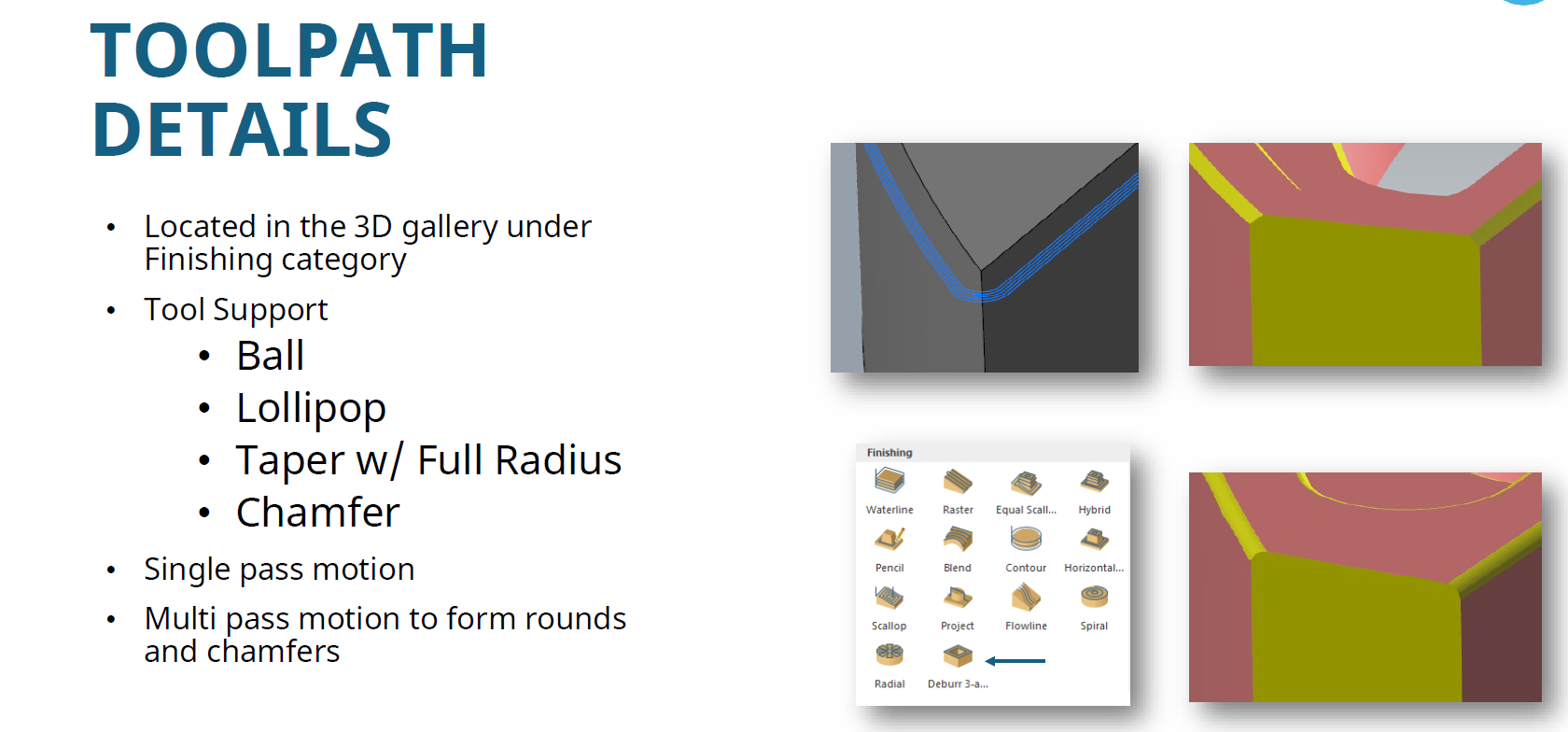 Funkcionalnost višestrukih prolaza: Izvedite više prolaza s kuglastim alatima za oblikovanje željenih skošenja ili zaobljenja.Jednostavna integracija: Dostupno s Mastercam 2D i Mastercam 3D, Router ili Mill-Turn licencomUšteda vremena i resursa: Smanjite ručni rad i iskoristite smanjeno vrijeme programiranja zahvaljujući automatskom otkrivanju rubova.
