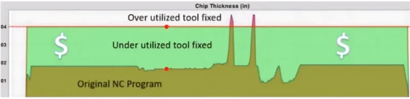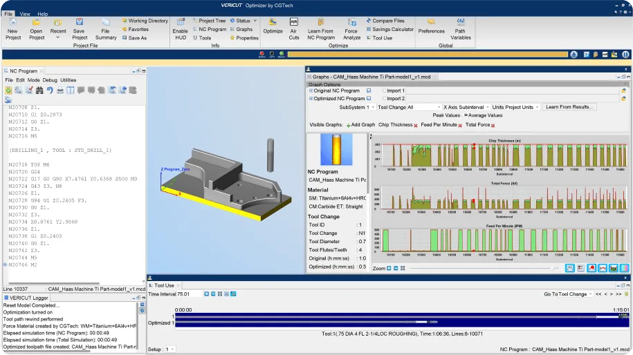 Osim optimizacije brzina pomaka, Vericut Optimizer omogućuje i optimizaciju sila rezanja na samom alatu. Određene operacije obrade mogu rezultirati lomom alata ili lošom površinskom obradom obratka, što se može optimizirati pomoću grafova u Optimizatoru.