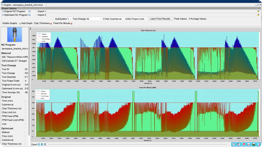 - Steknite korisne uvide – Pristupite grafikonima s podacima o silama, snazi/okretnom momentu, debljini strugotine, brzinama uklanjanja materijala, otklonima alata i brzinama posmaka rez po rez.